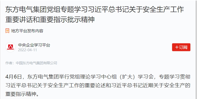 4月6日,東方電氣集團(tuán)舉行黨組理論學(xué)習(xí)中心組(擴(kuò)大)學(xué)習(xí)會(huì),專(zhuān)題學(xué)習(xí)貫徹習(xí)近平總書(shū)記關(guān)于安全生產(chǎn)工作的重要論述和習(xí)近平總書(shū)記近期關(guān)于安全生產(chǎn)的重要指示精神。