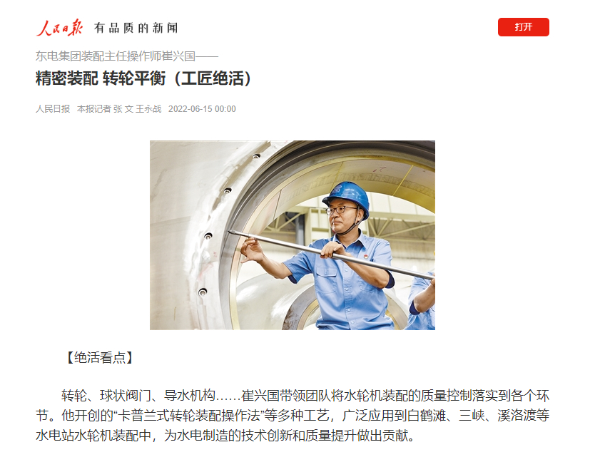 追求產(chǎn)品品質(zhì)與效率,崔興國(guó)還開(kāi)創(chuàng)了“卡普蘭式轉(zhuǎn)輪裝配操作法”等多種工藝,廣泛應(yīng)用到白鶴灘、三峽、溪洛渡等特大型水電站水輪機(jī)裝配中,為水電制造的技術(shù)創(chuàng)新和質(zhì)量提升做出貢獻(xiàn)?!爸挥型ㄟ^(guò)技能水平的提高制造出更高質(zhì)量的產(chǎn)品,才能為社會(huì)創(chuàng)造價(jià)值?!痹诖夼d國(guó)看來(lái),從事制造業(yè)就意味著要不斷提升技能水平,追求更高的標(biāo)準(zhǔn)。