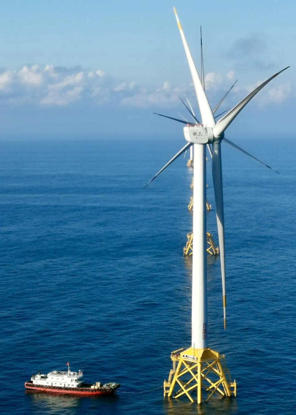 東方電氣自主研制的18兆瓦半直驅海上風電機組,是全球在運最大海上風電機組,機組設計、控制策略、機組及部套可靠性進一步優(yōu)化提升,具備超強的抗臺風能力。該機組安裝的126米葉片,解決了超長柔性葉片可靠承載技術難題,并基于約束進化算法,實現(xiàn)了葉片的氣動性能和載荷重量的最佳匹配,一體化葉片成型工藝,保證葉片在臺風中有超強表現(xiàn)。該機組塔筒專為抗臺風定制化設計,充分考慮抗臺風要求,具有抵御17級及以上臺風能力。