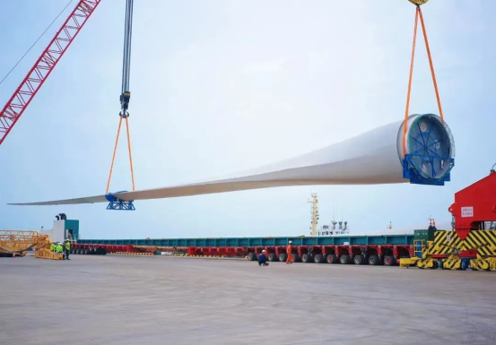 單支長度達(dá)153米的“葉片長龍”,長度堪比4架C919客機首尾相接,運輸難度極高。從工廠到港口的運輸路線如“障礙賽”,高壓線、橋梁、急彎層層阻隔,發(fā)運團隊提前半年實地勘測,多次復(fù)勘定制“分段式護送”方案。