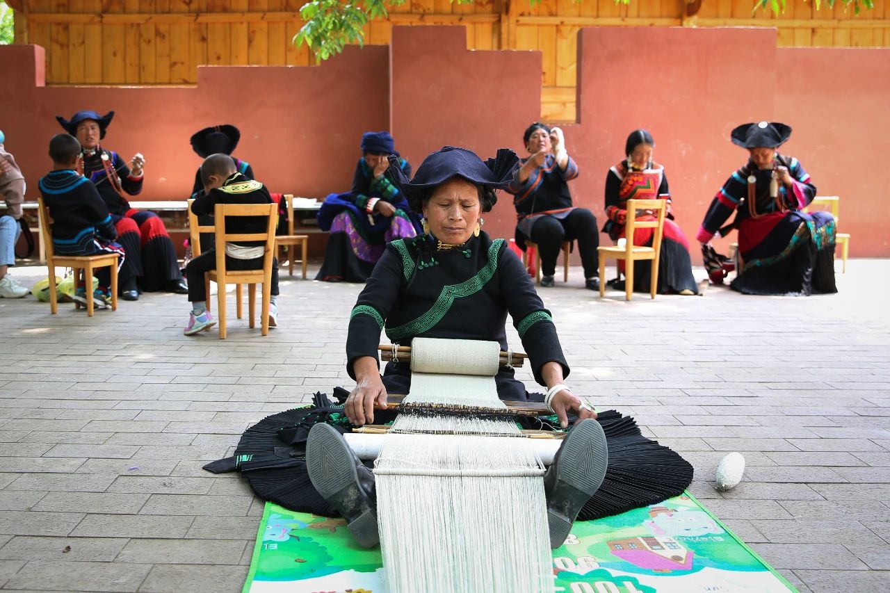 昭覺(jué)縣特布洛村村民正在村民活動(dòng)廣場(chǎng)手工染織“查爾瓦”(“查爾瓦”是彝族地區(qū)不論男女都喜歡披的一種羊毛織披氈)