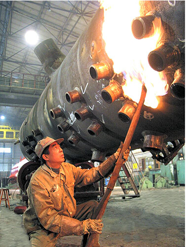 2005年,鐘家權(quán)光榮退休了,但是,摯愛東鍋的鐘家權(quán),在公司、車間領(lǐng)導(dǎo)和職工的關(guān)心支持下,又拿起了焊槍,與昔日的伙伴們一起奮戰(zhàn)在核電工段,參與了廣東嶺澳核電站二期1000MW核島主設(shè)備制造。經(jīng)過(guò)1年時(shí)間的艱苦奮斗,2006年8月份,順利完成3臺(tái)安注箱的焊接任務(wù);2006年10月初,要求高、工作條件最為艱苦的1臺(tái)硼注射器焊接難關(guān)又被攻克了,為東方鍋爐按期履行合同做出了新的貢獻(xiàn)。在安注箱啟運(yùn)前的那一刻,鐘家權(quán)讓記者拍照留下了這一令他一輩子自豪而又難忘的瞬間……