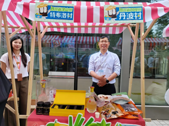 ▲東方電氣集團(tuán)駐昭覺縣特布洛村第一書記楊振攜大涼山的苦蕎茶、烏金豬臘肉香腸等特色農(nóng)產(chǎn)品亮相人民日報社“駐村市集”