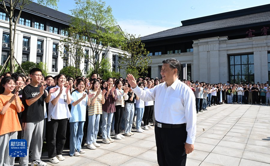 6月8日,中共中央總書(shū)記、國(guó)家主席、中央軍委主席習(xí)近平在四川考察。這是8日下午,習(xí)近平在宜賓學(xué)院考察時(shí),向師生們揮手致意。新華社記者 李學(xué)仁 攝