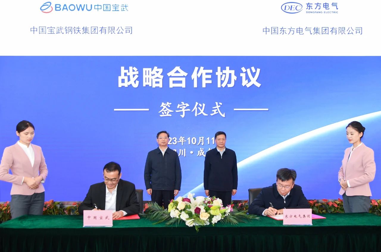 本網(wǎng)訊 10月11日,中國東方電氣集團(tuán)有限公司與中國寶武鋼鐵集團(tuán)有限公司在蓉簽署戰(zhàn)略合作協(xié)議。在東方電氣集團(tuán)黨組書記、董事長俞培根,中國寶武黨委書記、董事長胡望明的共同見證下,東方電氣集團(tuán)黨組成員、副總經(jīng)理李忠軍,中國寶武黨委常委、寶鋼股份黨委書記、董事長鄒繼新代表雙方簽字。