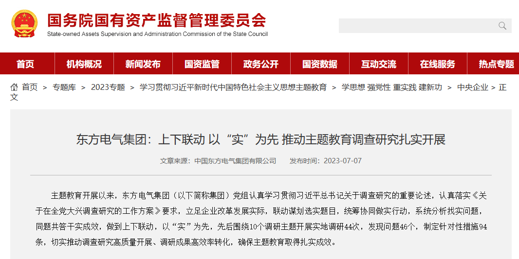 主題教育開展以來,東方電氣集團(tuán)(以下簡稱集團(tuán))黨組認(rèn)真學(xué)習(xí)貫徹習(xí)近平總書記關(guān)于調(diào)查研究的重要論述,認(rèn)真落實(shí)《關(guān)于在全黨大興調(diào)查研究的工作方案》要求,立足企業(yè)改革發(fā)展實(shí)際,聯(lián)動謀劃選實(shí)題目,統(tǒng)籌協(xié)同做實(shí)行動,系統(tǒng)分析找實(shí)問題,同題共答干實(shí)成效,做到上下聯(lián)動,以“實(shí)”為先,先后圍繞10個調(diào)研主題開展實(shí)地調(diào)研44次,發(fā)現(xiàn)問題46個,制定針對性措施94條,切實(shí)推動調(diào)查研究高質(zhì)量開展、調(diào)研成果高效率轉(zhuǎn)化,確保主題教育取得扎實(shí)成效。