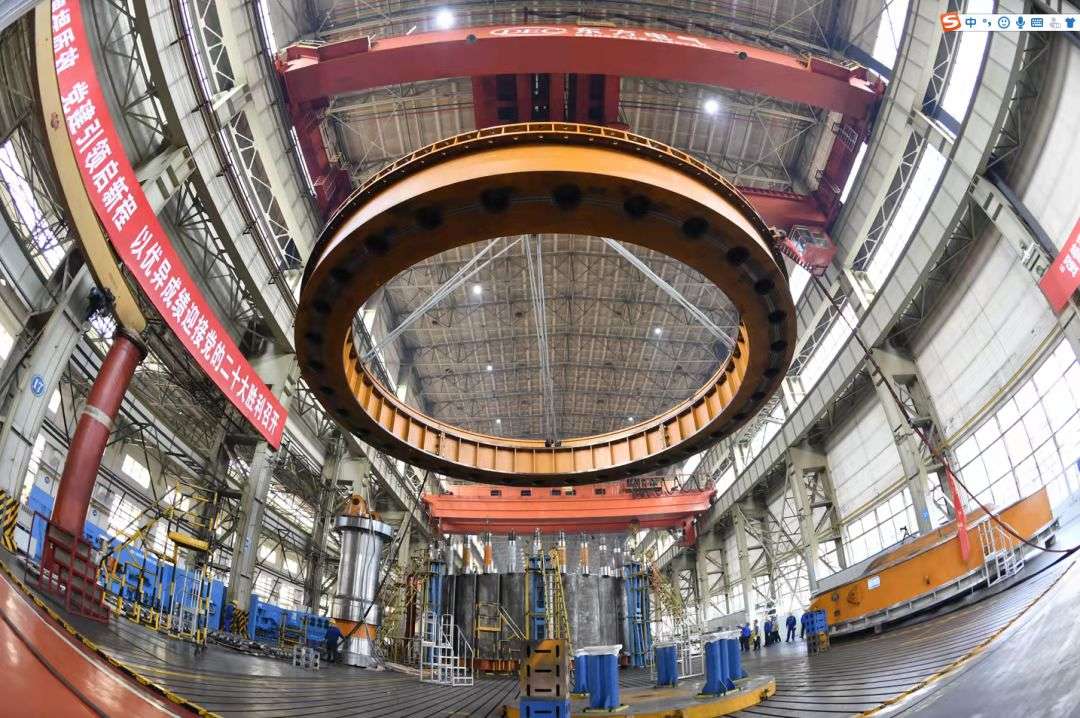 該導(dǎo)水機構(gòu)最大外徑為14.6米,裝配高度8米多,參與預(yù)裝的所有部件總重量超過1000噸。因尺寸大、重量大,該導(dǎo)水機構(gòu)在廠內(nèi)實現(xiàn)整體預(yù)裝,也創(chuàng)造東方電機水電制造史上多個“首次”。