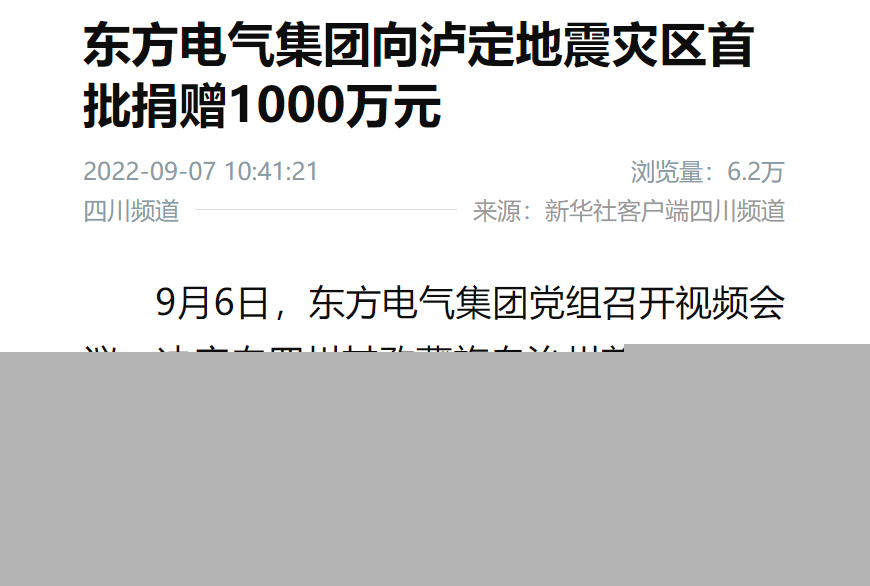 9月6日,東方電氣集團(tuán)黨組召開視頻會(huì)議,決定向四川甘孜藏族自治州慈善總會(huì)和四川雅安市慈善總會(huì)首批捐贈(zèng)資金1000萬(wàn)元,助力“9·5”瀘定地震災(zāi)區(qū)開展受災(zāi)人員救助及災(zāi)后重建工作。