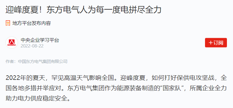 2022年的夏天,罕見(jiàn)高溫天氣影響全國(guó)。迎峰度夏,如何打好保供電攻堅(jiān)戰(zhàn),全國(guó)各地多措并舉應(yīng)對(duì)。東方電氣集團(tuán)作為能源裝備制造的“國(guó)家隊(duì)”,所屬企業(yè)全力助力電力供應(yīng)穩(wěn)定安全。