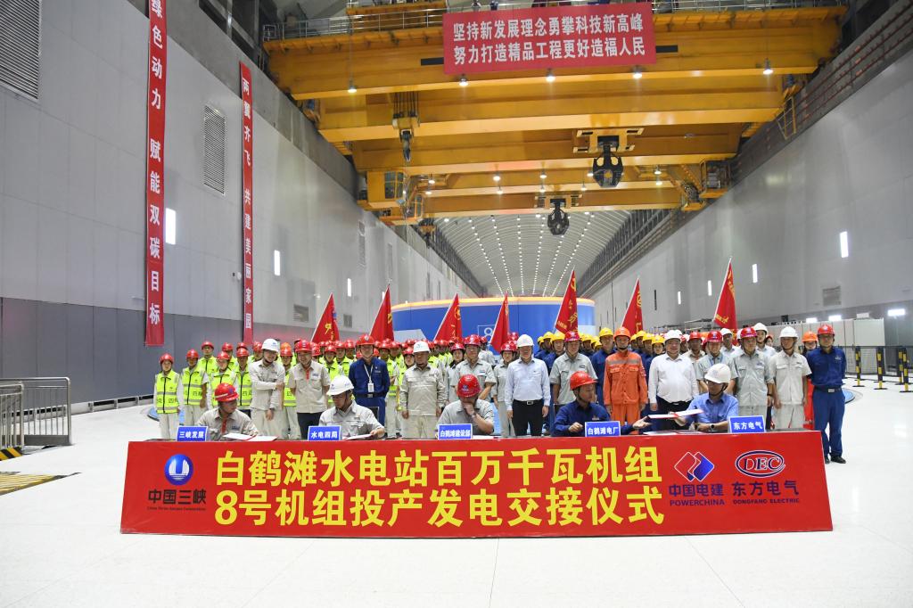 白鶴灘水電站位于四川省寧南縣和云南省巧家縣交界處的金沙江下游干流河段上,是實施“西電東送”的國家重大工程,也是當今世界在建規(guī)模最大、技術難度最高的水電工程。白鶴灘水電站裝機總容量1600萬千瓦,左右兩岸分別安裝8臺單機容量100萬千瓦的水電機組,左岸8臺機組由東方電氣自主研制供貨。2021年6月28日,白鶴灘水電站首批機組投產發(fā)電。