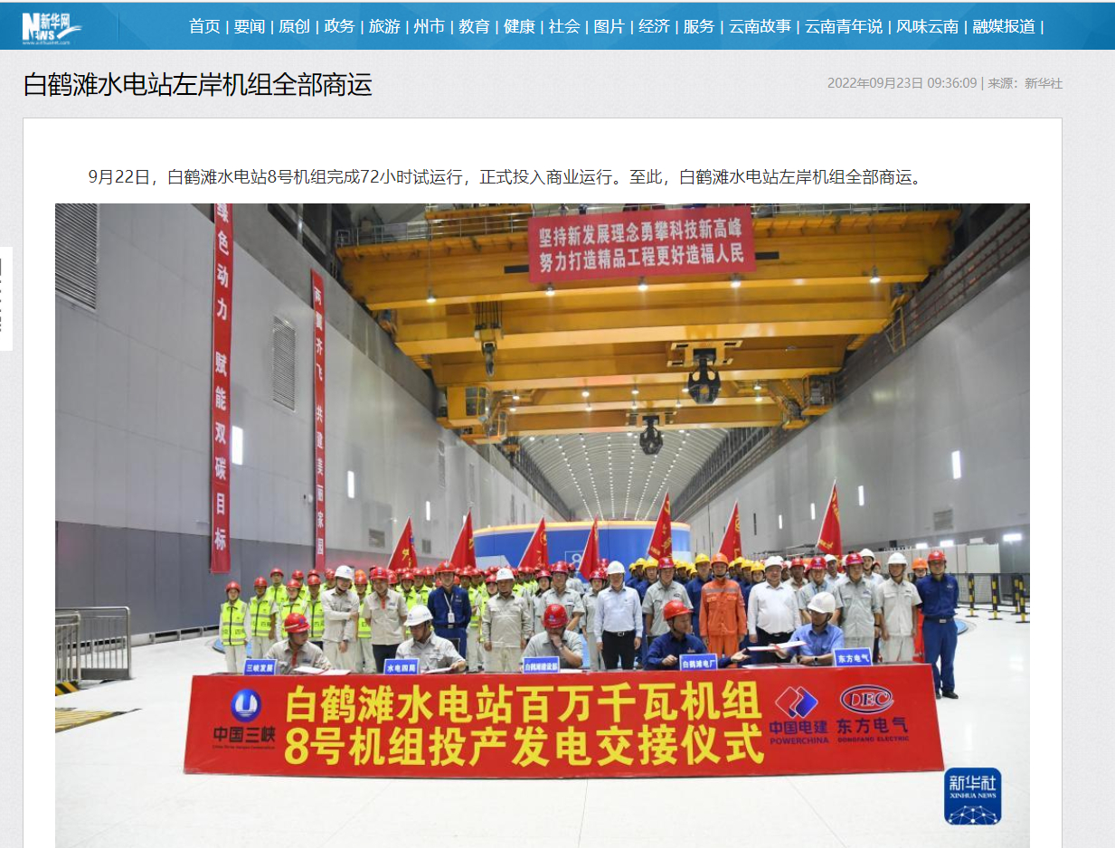 9月22日,白鶴灘水電站8號機組完成72小時試運行,正式投入商業(yè)運行。至此,白鶴灘水電站左岸機組全部商運。
