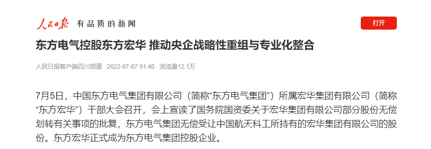 7月5日,中國(guó)東方電氣集團(tuán)有限公司(簡(jiǎn)稱“東方電氣集團(tuán)”)所屬宏華集團(tuán)有限公司(簡(jiǎn)稱“東方宏華”)干部大會(huì)召開(kāi),會(huì)上宣讀了國(guó)務(wù)院國(guó)資委關(guān)于宏華集團(tuán)有限公司部分股份無(wú)償劃轉(zhuǎn)有關(guān)事項(xiàng)的批復(fù),東方電氣集團(tuán)無(wú)償受讓中國(guó)航天科工所持有的宏華集團(tuán)有限公司的股份。東方宏華正式成為東方電氣集團(tuán)控股企業(yè)。