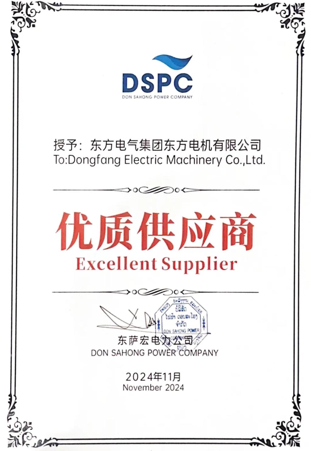 東薩宏電力公司向東方電機(jī)頒發(fā)的“優(yōu)質(zhì)供應(yīng)商”證書,是對(duì)機(jī)組運(yùn)行優(yōu)異的最好證明。