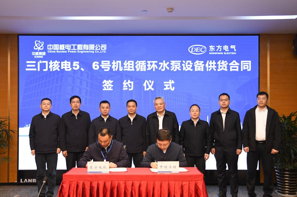 2月25日,東方電氣集團(tuán)所屬東方電機與中國核電工程有限公司進(jìn)行三門核電5、6號機組循環(huán)水泵設(shè)備供貨合同簽約。簽約儀式上,雙方圍繞核電技術(shù)創(chuàng)新、產(chǎn)業(yè)協(xié)同發(fā)展等展開深入討論。