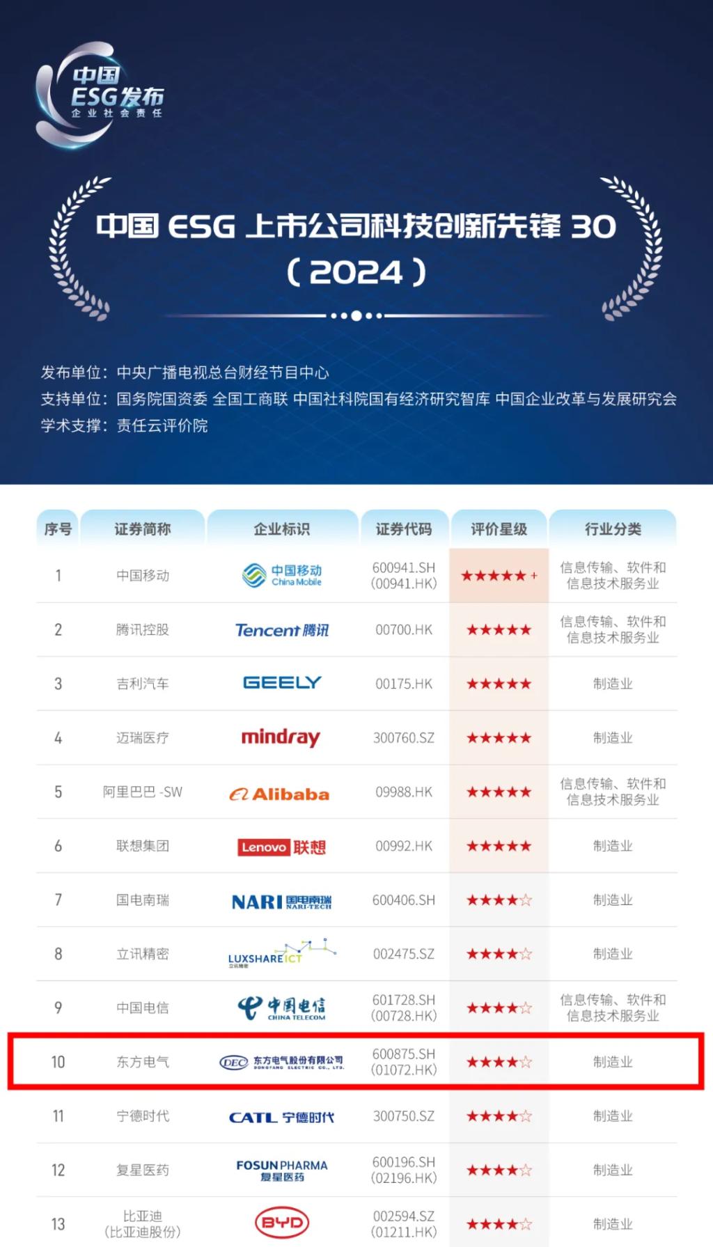 近日,由中央廣播電視總臺聯(lián)合國務(wù)院國資委、全國工商聯(lián)、中國社科院國有經(jīng)濟研究智庫、中國企業(yè)改革與發(fā)展研究會等權(quán)威機構(gòu)聯(lián)合推出的《科技創(chuàng)新ESG行動報告(2024)》正式發(fā)布。東方電氣憑借在科技創(chuàng)新和ESG(環(huán)境、社會和公司治理)領(lǐng)域的卓越表現(xiàn),成功入選“中國ESG上市公司科技創(chuàng)新先鋒30(2024)”榜單,位列榜單第十位。