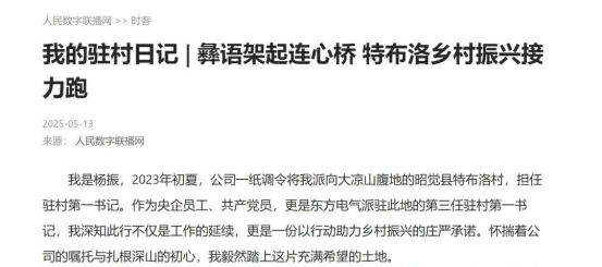 近日,“牢記囑托 駐村興農(nóng)”駐村第一書記交流會暨2025年版《駐村第一書記說》專欄發(fā)布會在北京人民日報社舉行。東方電氣集團(tuán)應(yīng)邀參加,駐昭覺縣特布洛村第一書記楊振參會,與來自全國10余個省份的駐村第一書記、專家學(xué)者、企業(yè)代表及媒體記者,就黨建引領(lǐng)、產(chǎn)業(yè)融合、數(shù)字化賦能等鄉(xiāng)村振興關(guān)鍵議題展開深入交流。