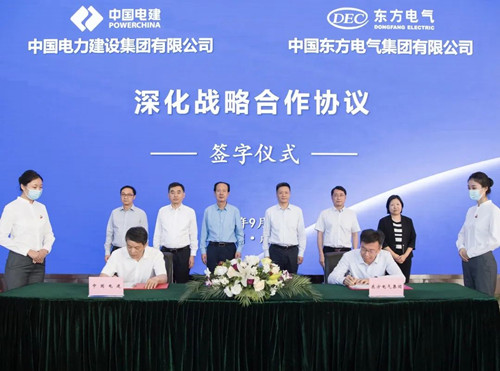本網(wǎng)訊 9月28日,中國東方電氣集團(tuán)有限公司與中國電力建設(shè)集團(tuán)有限公司在蓉簽署深化戰(zhàn)略合作協(xié)議。在東方電氣集團(tuán)黨組書記、董事長俞培根和中國電建黨委書記、董事長丁焰章的共同見證下,東方電氣集團(tuán)黨組成員、副總經(jīng)理李忠軍和中國電建總經(jīng)濟(jì)師劉明江代表雙方在深化戰(zhàn)略合作協(xié)議上簽字。