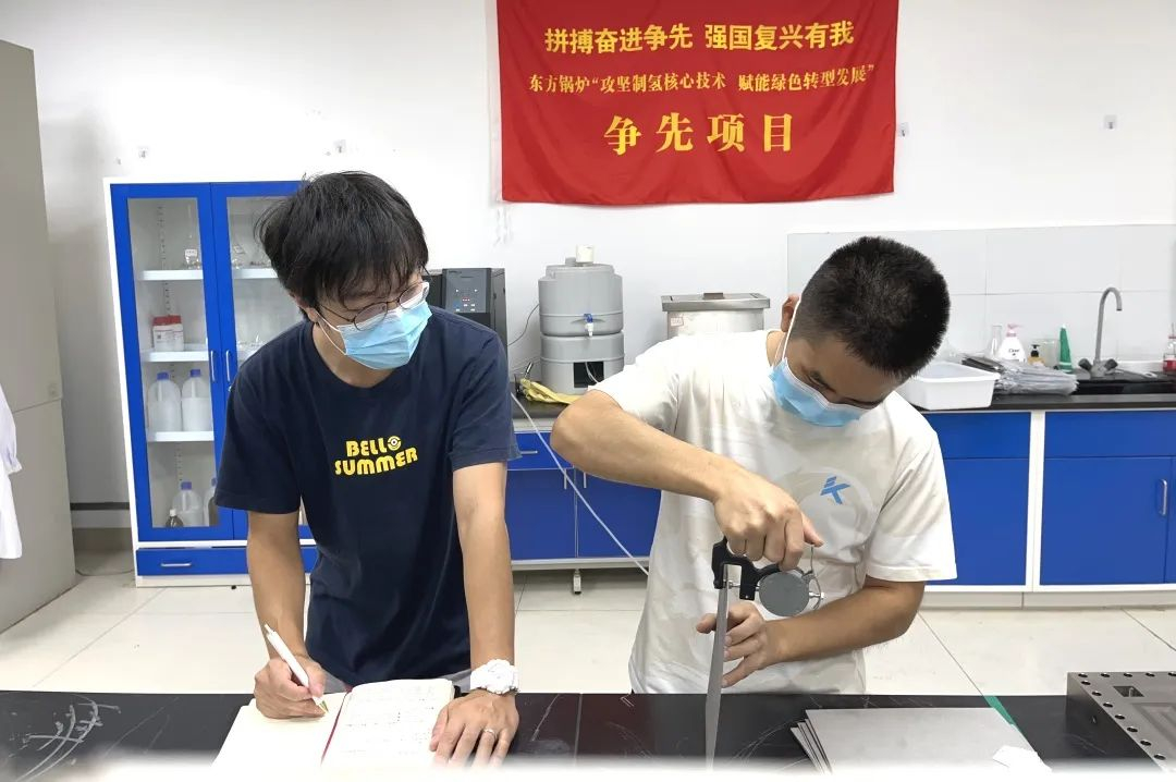 通過深入開展“三強三促”創(chuàng)先爭優(yōu)主題實踐活動,牽頭搭建“四川省氫能創(chuàng)新聯(lián)合體”等試驗平臺,東方鍋爐積極調(diào)動資源,為“爭先項目”攻關(guān)“開路”“架橋”。其中,技術(shù)創(chuàng)新中心黨委第五黨支部開展“創(chuàng)新助力轉(zhuǎn)型”專項行動,成立PEM電解水制氫技術(shù)黨員攻關(guān)隊,充分發(fā)揮黨員先鋒模范作用,形成“1名黨員帶頭、N名群眾爭先”聯(lián)動網(wǎng)絡,為核心技術(shù)攻關(guān)凝聚強大合力。加快實現(xiàn)產(chǎn)氫規(guī)模行業(yè)領先目標,必須盡快啃下“電解槽有效接觸面實現(xiàn)自由調(diào)控,且密封性能達到設計要求”這一“硬骨頭”。在接觸面積不可預測且無法測量的艱難條件下,攻關(guān)隊成員發(fā)揚“敢攻堅、勇克難”的斗爭精神,查閱大量文獻材料、召開多次分析討論會,開展晝夜不間斷實驗測試,對電解槽結(jié)構(gòu)進行三次重大改進,不斷優(yōu)化實驗表征方法,終于順利完成PEM電解槽和電解系統(tǒng)設計。