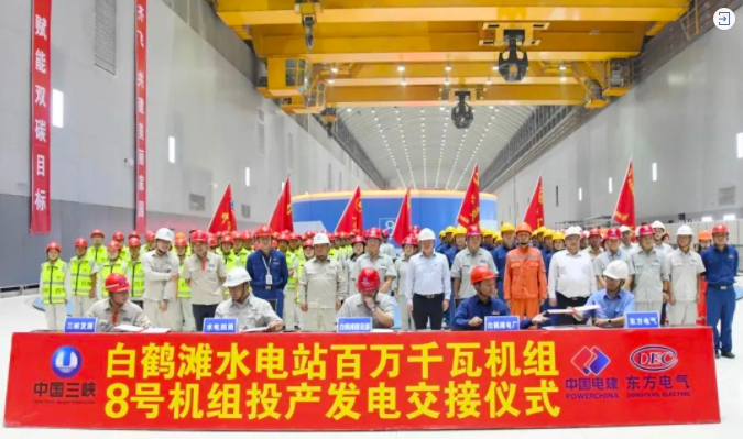 2022年9月22日,隨著8號機組完成72小時試運行,金沙江白鶴灘水電站左岸全部8臺機組投產(chǎn)。至此,東方電氣白鶴灘項目研發(fā)制造、安裝服務任務圓滿收官。