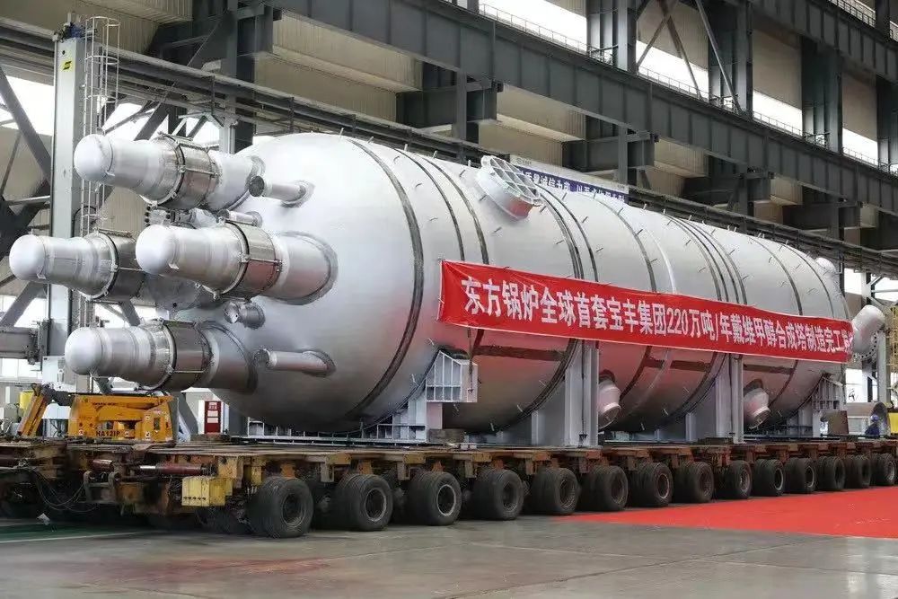 2019年,全球首套寧夏寶豐能源集團年產(chǎn)220萬噸戴維甲醇合成塔在東方鍋爐德陽制造基地完工發(fā)運。該甲醇合成塔是當(dāng)時世界單套煤制甲醇產(chǎn)量最大的甲醇合成塔,也是戴維技術(shù)甲醇合成塔首次國產(chǎn)化。該產(chǎn)品的成功制造標(biāo)志著,東方鍋爐在大型甲醇合成塔制造領(lǐng)域一舉打破了國外的壟斷地位,走在了世界的前列。該甲醇合成塔重達512噸,創(chuàng)造了東方鍋爐單臺套產(chǎn)品成套出廠噸位的歷史之最。