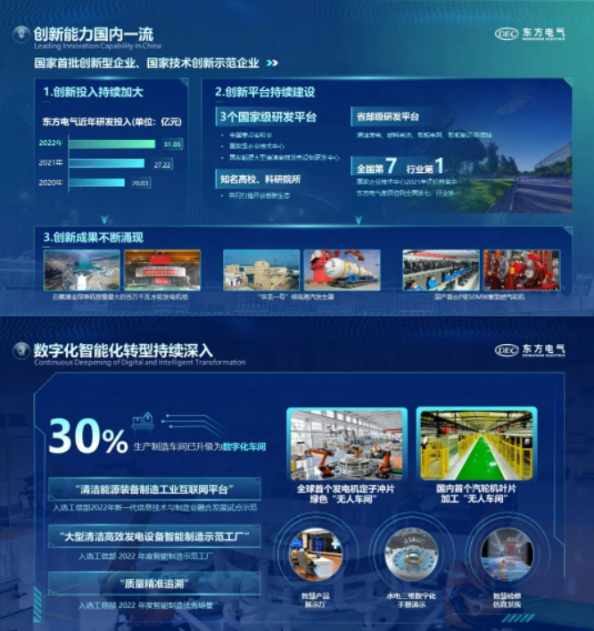 2022年,公司堅(jiān)持科技創(chuàng)新戰(zhàn)略引領(lǐng),制定發(fā)布中長(zhǎng)期科技創(chuàng)新規(guī)劃;強(qiáng)化創(chuàng)新平臺(tái)建設(shè),構(gòu)建領(lǐng)先的水電、氫能等產(chǎn)業(yè)創(chuàng)新聯(lián)合體。科技創(chuàng)新成果突出,完成國(guó)內(nèi)首臺(tái)自主知識(shí)產(chǎn)權(quán)F級(jí)50MW重型燃?xì)廨啓C(jī)等一批科技創(chuàng)新成果。公司堅(jiān)持綠色轉(zhuǎn)型與數(shù)字化轉(zhuǎn)型協(xié)同發(fā)展,發(fā)布碳達(dá)峰碳中和行動(dòng)方案、數(shù)字化轉(zhuǎn)型行動(dòng)計(jì)劃,創(chuàng)新驅(qū)動(dòng)企業(yè)核心競(jìng)爭(zhēng)力不斷提升。
