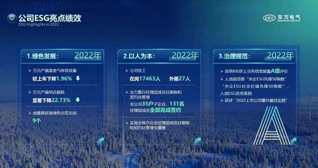 2022年,東方電氣緊抓行業(yè)發(fā)展機(jī)遇、沉著應(yīng)對(duì)挑戰(zhàn),全力服務(wù)構(gòu)建新型能源體系,有力推動(dòng)生產(chǎn)經(jīng)營(yíng)持續(xù)向好。全年實(shí)現(xiàn)營(yíng)業(yè)總收入553.53億元,同比增長(zhǎng)15.76%;歸屬于母公司股東的凈利潤(rùn)28.55億元,同比增長(zhǎng)24.71%;加權(quán)平均凈資產(chǎn)收益率為8.43%,比上年同期增加1.23個(gè)百分點(diǎn)。在業(yè)績(jī)?cè)鲩L(zhǎng)的同時(shí),公司持續(xù)增進(jìn)股東回報(bào),擬向全體股東每10股派發(fā)現(xiàn)金紅利3.35元,總計(jì)派發(fā)約10.45億元,分紅比例同比上年提升5.26個(gè)百分點(diǎn),充分彰顯“共創(chuàng)價(jià)值,共享成功”的企業(yè)價(jià)值觀。